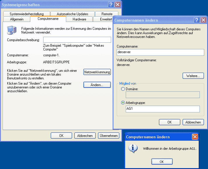 Dies ist für alle Rechner der Arbeitsgruppe durchzuführen, d.h. die Rechner müssen mit der gleichen Arbeitsgruppe definiert werden und müssen einen eindeutigen Computernamen besitzen. Ein anderer Rechner der Arbeitsgruppe AG1 wurde z.B. mit dem Computernamen "pc1" versehen.