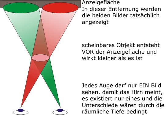 Das ist die Grundlage stereoskopischer Wahrnehmung schlechthin. Da das Hirn nicht über die Information verfügt, dass in Wirklichkeit zwei verschiedene Bilder vorhanden sind, geht es, wenn genügend Ähnlichkeiten vorhanden sind, davon aus, dass beide Augen das gleiche Bild wahrnehmen (Sind die Bilder zu unterschiedlich ist eine klare Wahrnehmung nicht möglich). Da ein einzelnes Auge immer nur 2-dimensional wahrnehmen kann, weiß das Hirn über die räumliche Tiefe nicht Bescheid, aber es kennt zumindest die Richtung, in der sich das Objekt befindet. Wird die Information beider Augen kombiniert, gibt es genau einen Schnittpunkt, an dem beide Augen das Objekt vermuten. Bei einem einzelnen Objekt oder Bild trifft diese Berechnung auch zu. 3D-Bilder jedoch nutzen genau diese Arbeitsweise des Hirns um durch eine künstlich verschobene Darstellung zweier Bilder dem Hirn räumliche Tiefe vorzugaukeln.