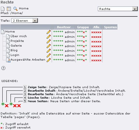 Es existieren die zwei Ansichten Benutzer-Übersicht und Rechte. In der Ansicht Rechte wird für den Besitzer, die Gruppe und alle anderen Benutzer dargestellt, welche Operationen mit der Seite durchgeführt werden dürfen. Durch die Auswahlbox Tiefe wird festgelegt, wieviele Ebenen des Seitenbaums dargestellt werden. Folgende Operationen sind für eine Seite möglich: