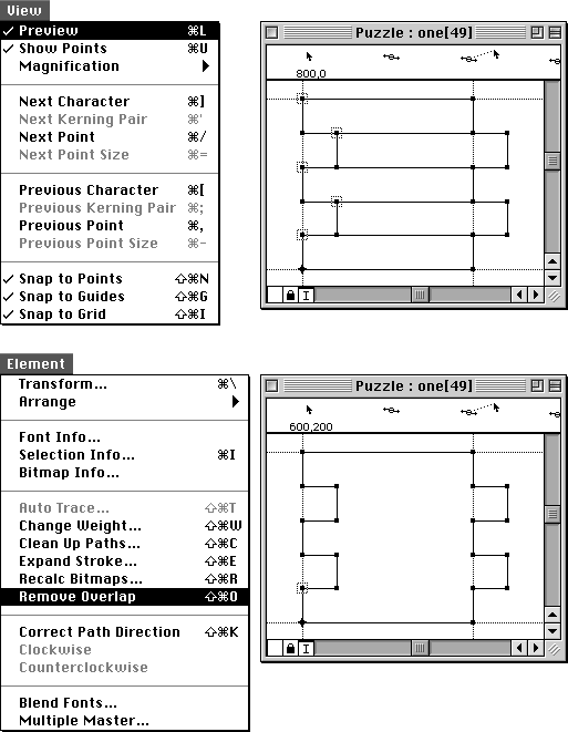 Mit "->Edit ->select all" wählen wir alles aus, mit "->Edit ->Copy" kopieren wir das Zeichen, schließen das Bearbeitungsfenster des Zeichens durch Mausklick auf das Schließfeld links oben im Eck des Fensters und öffnen durch Doppelklick das Bearbeitungsfenster des nächsten Zeichens. Hier fügen wir durch "->Edit ->Paste" den Puzzlestein nochmals ein.