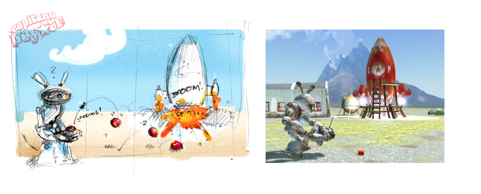 Technik: Da wir es nun mit nur einem Charakter und einem einfachen Setting zu tun haben, und es in dieser Szene sehr auf das Timing ankommt, wird diese im gesamten Stück animiert. Das erleichtert es ungemein, die Animation anzulegen. Ein Splitting erfolgt erst wieder beim Start der Rakete...