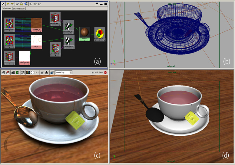 | (a) Hypershade: In Editoren wie der Hypershade in Maya oder der Material Editor in 3ds max werden Oberflächeneigenschaften definiert. (b) Interaktive 3d-Grafik: Drahtgitterdarstellung (d) Interaktiv 3d-Grafik: Schattierte Darstellung. (c) Rendering: Ein durch die Software berechnetes Pixel- oder Vectorrendering mit Spezialeffekten wie Schatten, Globale Beleuchtung, Spiegelungen und Lichtbrechungen. Die Dauer der Berechnung der Bilddatei hängt von den Rendereinstellungen ab. |