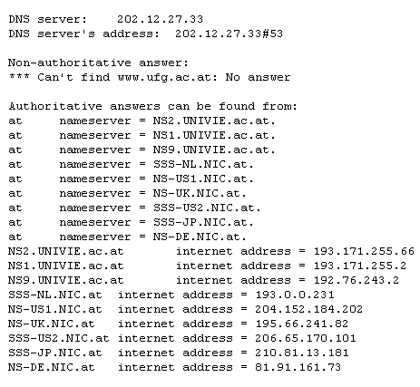 Erneute Anfrage an den DNS-Server (hier: ns.internet.ufg.ac.at), der nun auch ein Ergebnis liefert; die Iteration ist somit abgeschlossen.