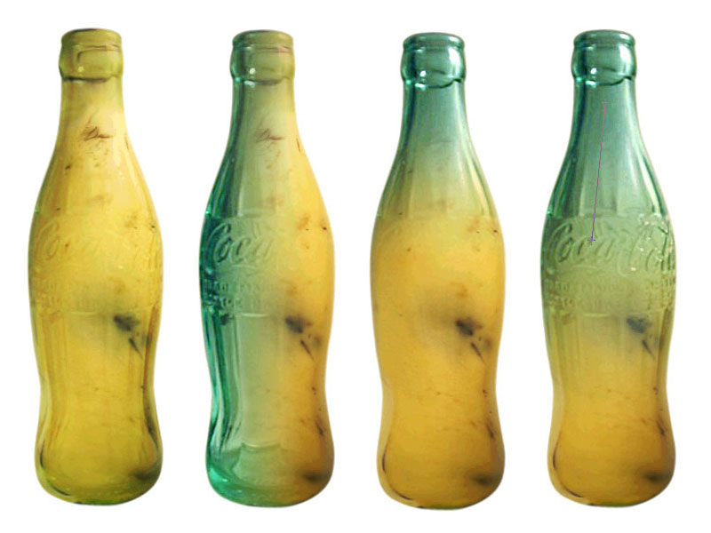 Beispiele für die umgeformte Banane in Kombination mit der Coca-Colaflasche.