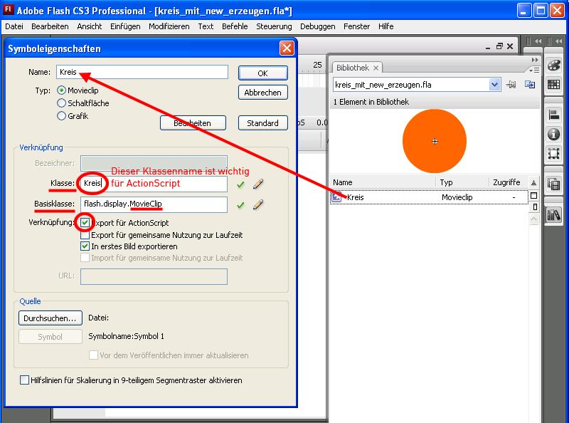 "Export für ActionScript" ist deshalb notwendig, weil beim Erstellen der swf-Datei normalerweise nur die Bibliothekselemente berücksichtigt werden, von denen Instanzen auf der Bühne liegen oder darin verwendet werden. Durch Aktivieren von "Export für ActionScript" wird erzwungen, dass die "Bauanleitung" aus der Bibliothek in die swf-Datei gepackt wird, obwohl noch keine Instanz auf der Bühne liegt.