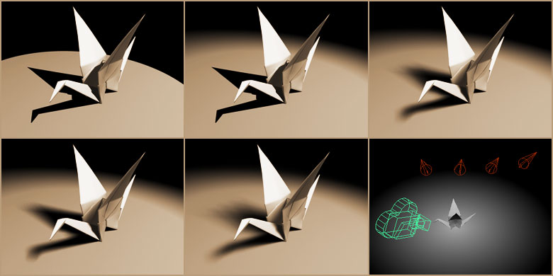 | 4 Punktlichter als Hauptlichtquellen mit weichen Schatten, eine Spotlichtquelle als Fülllicht, ein weiteres Umgebungslicht und eine Punktlichtquelle hinter dem Objekt. |