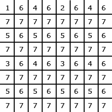 Adam7 unterteilt das Bild in 8x8 Bildpunkte große Blöcke, innerhalb dieser Blöcke werden dann in jedem Durchlauf die in der nachfolgenden Abbildung gekennzeichneten Punkte übertragen.