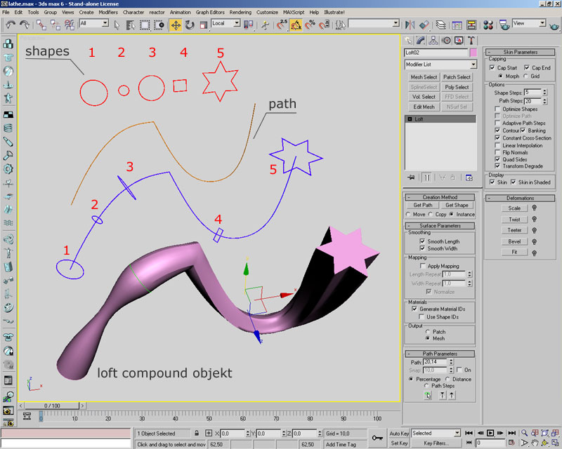 | In 3ds max wird die Extrusion entlag eines Pfades "Loft" bezeichnet. Das Loft Compound Objekt in 3ds max ist ein sehr umfangreiches Werkzeug zum Erstellen von Geometrien. Grundfunktion ist dabei das Extrudieren von Profilkurven entlang von Pfadkurven. |