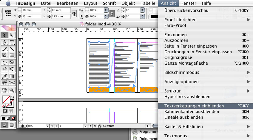 Wenn man die Textverkettungen überprüfen will, unter "Ansicht ->Textverkettungen einblenden" kann man sie anzeigen lassen.