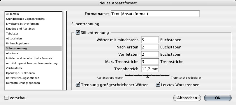 Weil der Text in Blocksatz gesetzt werden soll, findet also die automatische Silbentrennung Verwendung.