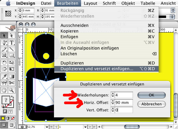 Weil das Piktogramm insgesamt fünfmal benötigt wird, wählen wir ->Objekt ->Duplizieren und versetzt einfügen... und geben als "Wiederholungen: 4" ein und als Versatz etwas weniger als die Figur breit ist. Bei mir ist die Breite der Figur, wie in der Kopfzeile im Bild unten ersichtlich, 91 Millimeter breit, deshalb verwende ich als "HorizontalerOffset: 90 (die Maßeinheit Millimeter mm muss man nicht unbedingt eintippen)". Der vertikale Offset bleibt auf null. Damit überlappen sich die einzelnen Sänger um einen Millimeter.