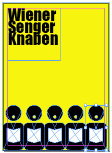 Dann gruppieren wir alle fünf Piktogramme (->Objekt ->Gruppieren) und skalieren wieder bei allen vier gedrückten Befehlstasten die Gruppe auf die Breite der Seite. Wenn man mit dem Lupenwerkzeug die Ecke vorher etwas vergrössert, erleichtert man sich das Leben und kann genauer arbeiten. Die Piktogramme müssen genauso wie der gelbe Hintergrund drei Millimeter über die Seite hinausstehen.
