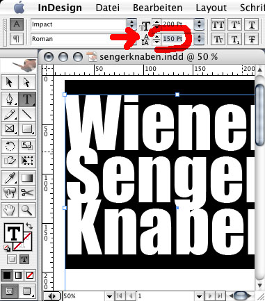 Auch den Zeilenabstand kann man mittels Tastatureingabe (150 pt eintippen) oder durch Klicken auf die kleinen schwarzen Pfeile nach unten oder nach oben einstellen, oder aus der Liste auswählen.