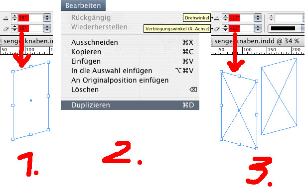 Dann verdoppeln wir die Gesangsbuchhälfte mit dem Befehl ->Bearbeiten ->Duplizieren und stellen in dem Dialogfeld den Winkel und die Neigung diesmal auf minus fünfzehn Grad ein.