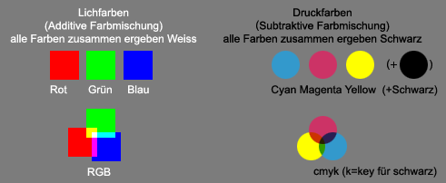 RGB ist das gängiste Modell für den Computer und alle anderen färbigen digitalen und analogen bildgebenden Systeme. Alle Fernseher, Monitore, Scanner, Digitalkameras und Videokameras beruhen auf RGB-Farbauszügen. Cmyk kommt immer dann ins Spiel, wenn Farbe auf Papier gebracht werden soll. Nachdem also in RGB gescannt wird, muß das Bild dann in cmyk umgerechnet werden, und hier treten durch den Wechsel des Farbsystems wiederum Farbabweichungen auf.