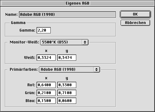 Adobe RGB 1998: Gamma 2,2, Weißpunkt 6500°K