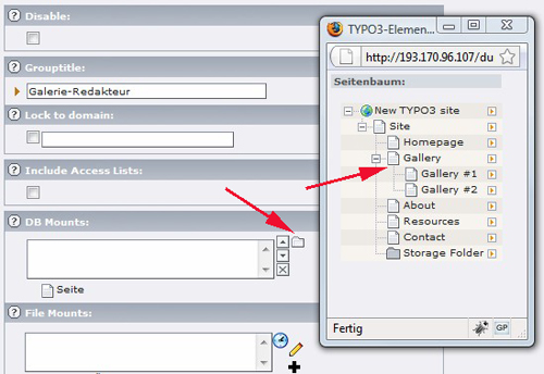 Im Feld "DB Mounts" können sie auswählen, welche Seitenbäume für ein Mitglied dieser Benutzergruppe sichtbar sein sollen. Klicken sie auf das Folder-Symbol um das Auswahlfenster zu öffnen. Wählen sie die Seite "Gallery" aus, wodurch der Zugriff auf diese Seite und ihre Unterseiten gewährleistet wird.