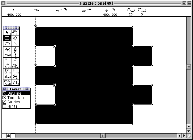 Mit "->Edit ->select all" wählen wir alles aus, mit "->Edit ->Copy" kopieren wir das Zeichen, schließen das Bearbeitungsfenster des Zeichens durch Mausklick auf das Schließfeld links oben im Eck des Fensters und öffnen durch Doppelklick das Bearbeitungsfenster des nächsten Zeichens. Hier fügen wir durch "->Edit ->Paste" den Puzzlestein nochmals ein.