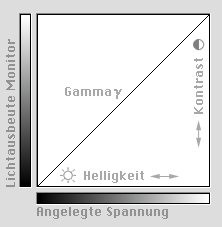 Im Bildschirm erfolgt die Umsetzung der elektrische Spannung in Licht nicht linear, sondern die mittleren Werte sind zu dunkel. Diese Abweichung läßt sich mit der mathematischen Funktion der Gammakurve beschreiben. Monitore können einen Gammawert zwischen etwa 1,5 und 3,5 haben, mit dem Alterungsprozess des Monitors werden die Phosphorfarben aber dunkler.