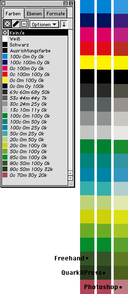 Wenn man einen in Freehand erstellten Farbstreifen als EPS speichert, sieht der dank der von Freehand mitgespeicherten Voransicht (am Mac) gleich aus. In Photoshop geöffnet und gerastert, kommen die Photoshop-Farbeinstellungen zum Tragen. Es wird versucht, die geringere Leuchtkraft von Druckfarbe zu simulieren.