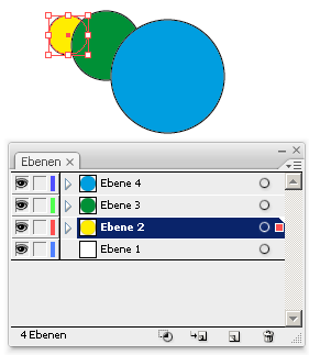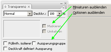 Sind die Objekte gruppiert und als “Aussparungsgruppe” angelegt, wird für die gesamte Gruppe die Transparenz zu dahinterliegenden Objekten bestimmt, nicht berücksichtigt wird also die Transparenz untereinander: