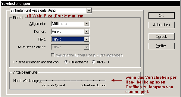 Numerische eingaben in Feldern erlauben den Suffix: Zoll, ", Millimeter, mm, Zentimeter, cm, Punkt, P, Pt, Pica, Pc, Pixel und Px